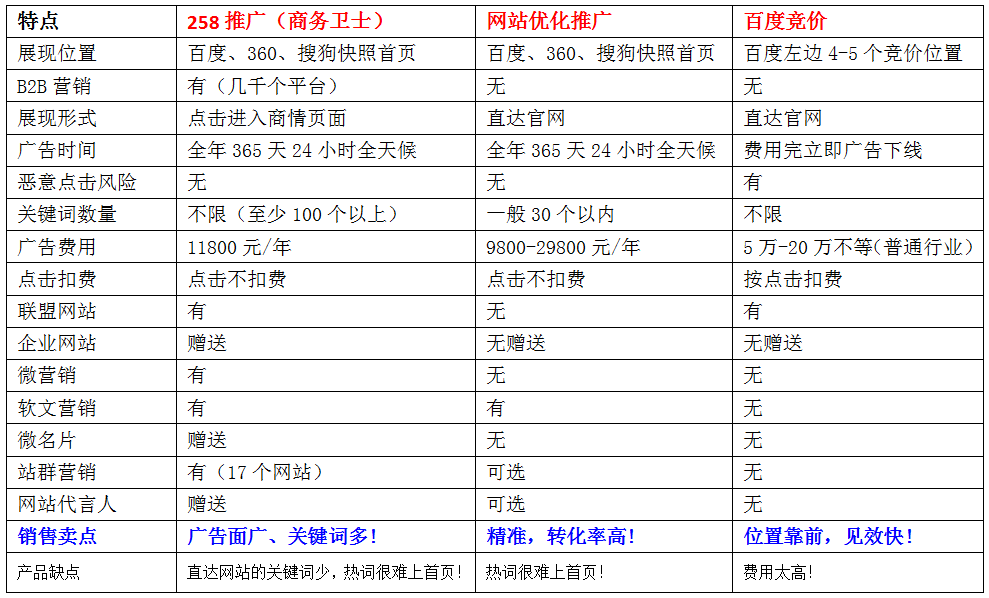 网络推广三大产品专业对比分析表